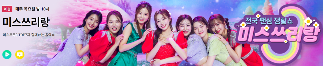 중장년층들에게 선풍적인 인기를 끌고 있는 미스쓰리랑입니다. 매주 목요일 밤 10시에 TV조선에서 방영하고 있습니다. 전국적으로 응원투표를 몰아가고 있는 그녀들의 현란한 음색을 다시 보고 싶으신 분들을 위해 아래의 링크를 남겨드립니다.
